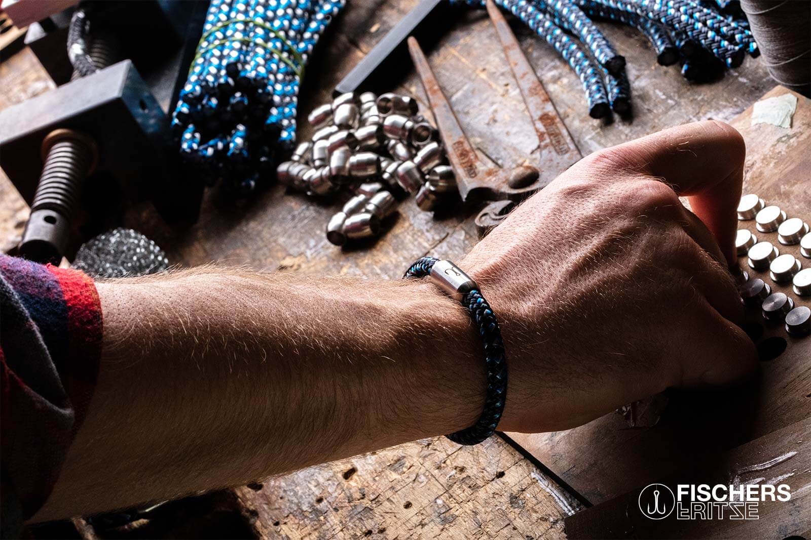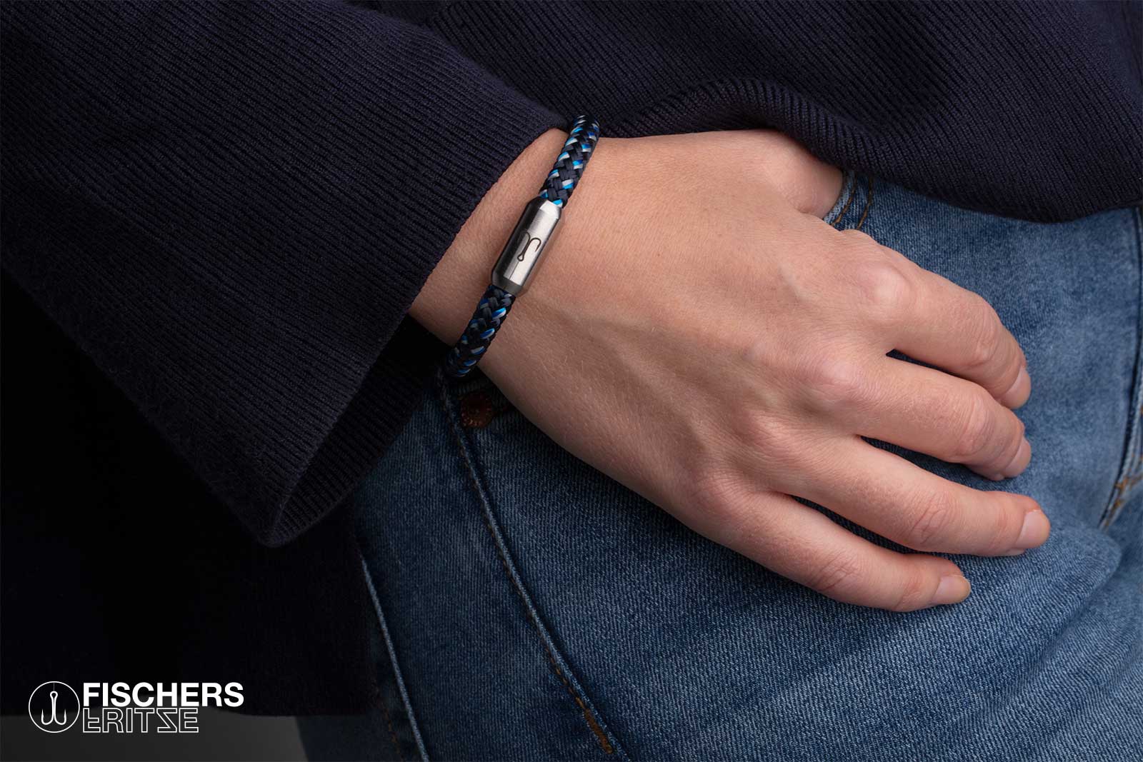 The thinner bracelet from Fischers Fritze. The new crab "FERDINANDA" in navy blue steel blue gray. Uncompromising, stable in a maritime look. sailing rope paired with an encapsulated stainless steel magnetic clasp - developed & designed by Fischers Fritze®.